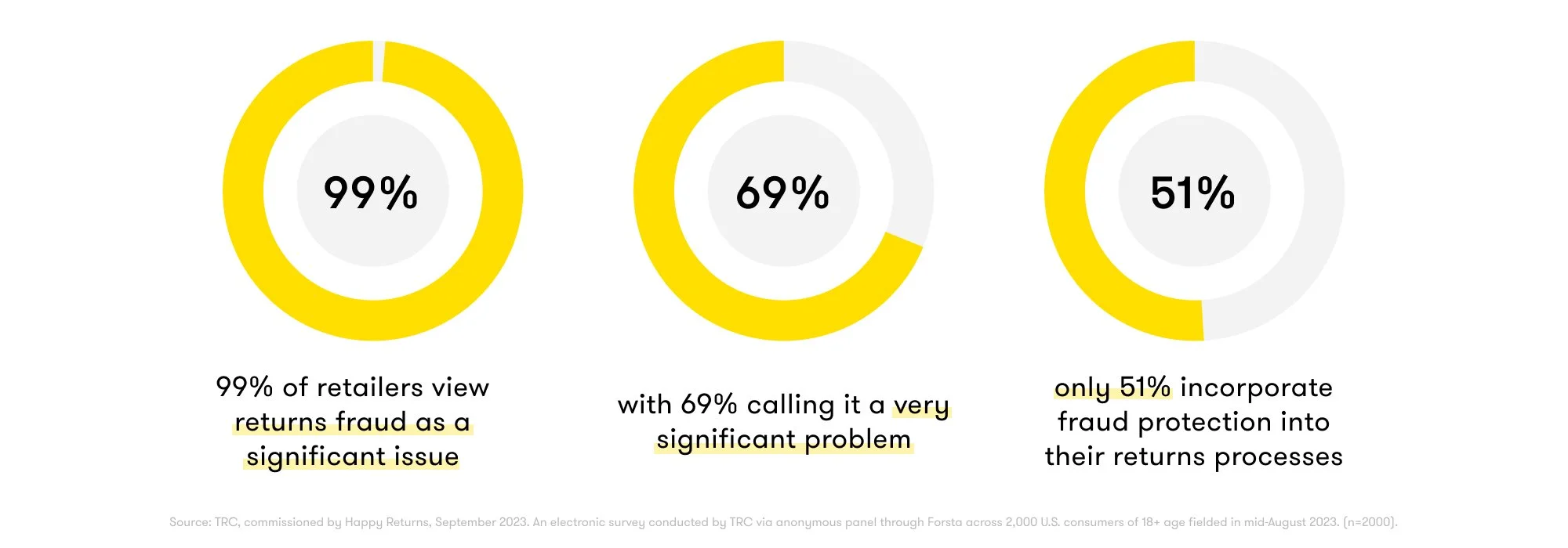 Our 2023 Returns Happen Study shows that 99% of retailers view returns fraud as a significant issue, with 69% calling it a very significant problem. Yet, only 51% incorporate fraud protection into their returns processes.