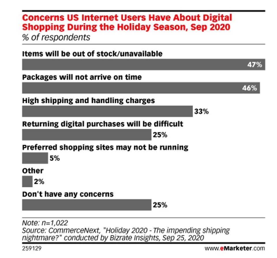 Holiday Season 2020: The Pandemic Edition Report by eMarketer revealed that 60% of retailers are concerned that shippers will cap deliveries during peak times and 49% of retailers have concerns about fulfillment centers keeping up with customer demand.