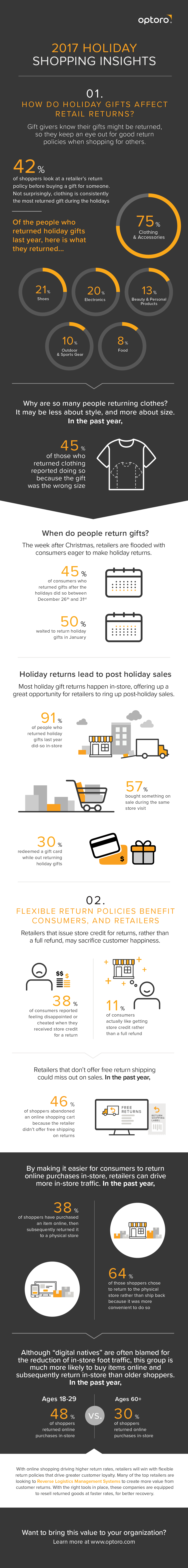 In 2017, about 45% of those returning gifts did so between Dec. 26 and 31, with 50% waiting until January to return, according to an Optoro study. Consumers are now recognizing the need to shop and return earlier.